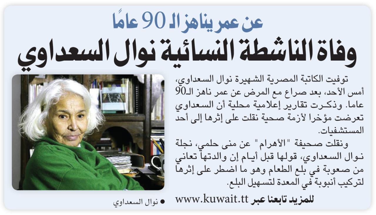 نوال السعداوي وفاة / ÙÙØ§Ù Ø§ÙØ³Ø¹Ø¯Ø§Ù٠بÙ٠تداÙÙ ÙÙØ¯ÙÙ Ù ÙÙÙÙØ§ Ù Ù Ø§ÙØ¯ÙÙ ÙØ¥Ø¨Ø±Ø§Ø² Ø¥Ø¨Ø¯Ø§Ø¹ÙØ§ Cnn Arabic - هي إحدى الشخصيات الأكثر إثارةً للجدل؛ حيث يصعب على القارئ أن يقف منها موقفًا وسطًا، فإما أن يكون معها وإما أن يكون ضدها.